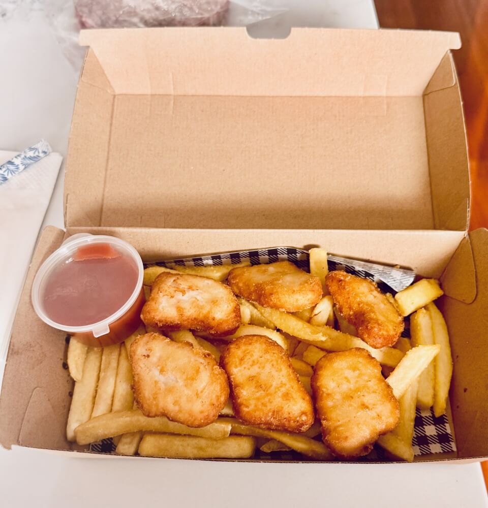 2 fried noodles, 2 burgers, family sized chips, 2 bottles of soft drinks