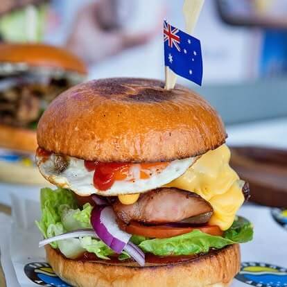 Smashed Beef patty, Bacon, fried Egg, American cheese, Cos lettuce, Spanish Onion, Beetroot, Pineapple, tomato, tomato sauce