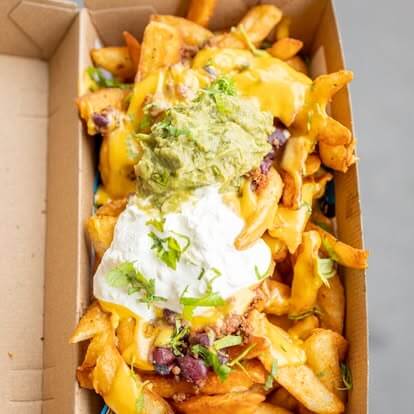 Chilli con carne, American cheese sauce, guacamole, sour cream