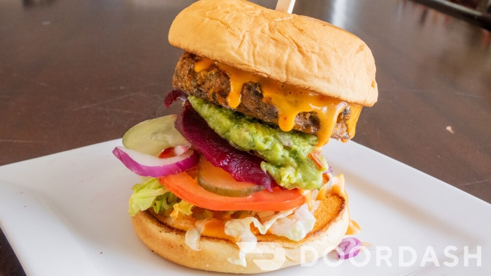 Veggie patty, lettuce, Tomato, Onion, Beetroot, guacamole, pickles, Vegan Sriracha Mayo