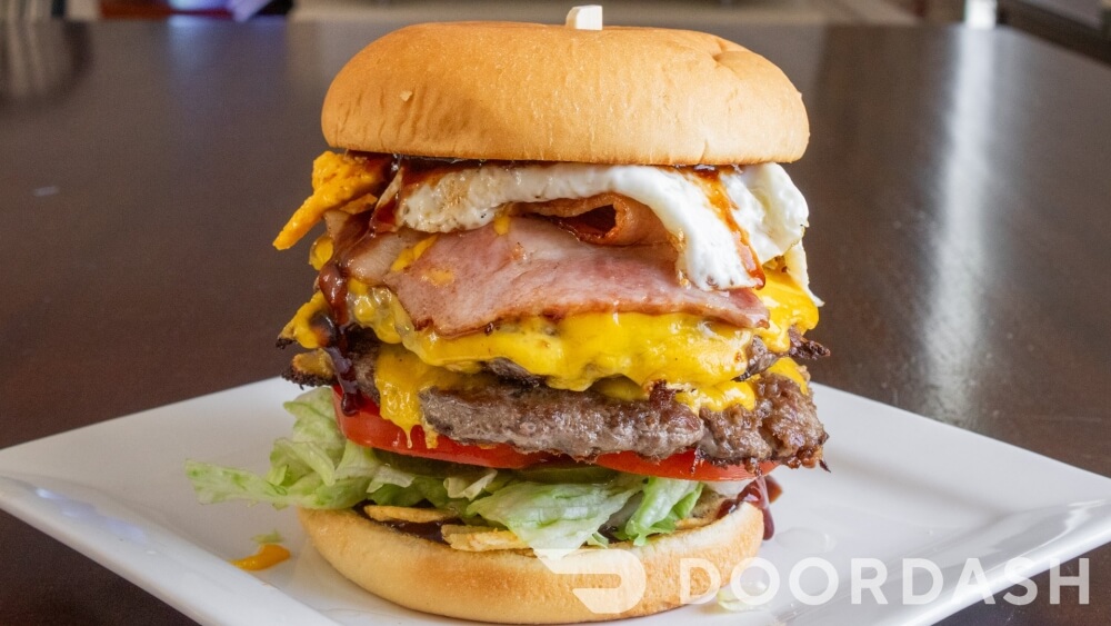 Double smashed beef, double bacon, Egg, double melted cheese, Lettuce, Tomato, Caramelised Onions, JalapeƱos, BBQ- flavoured potato chips, Smokey BBQ sauce