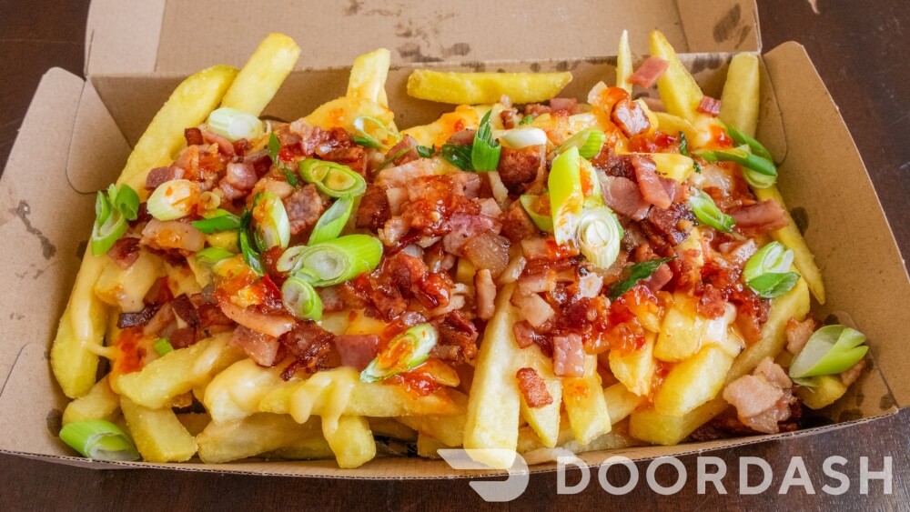 Diced Bacon, Caramelised Onions, American cheese sauce, salsa, jalapeƱo
